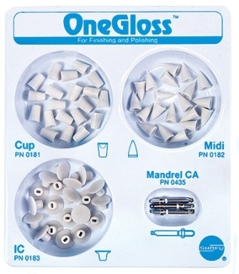 PN 0180 zestaw One Gloss Set składa się z 60 silikonowych gumek w trzech kształtach Cup, Midi-Point, IC (kielich, płomyk, dysk) oraz trzech trzymadeł na kątnicę (CA)